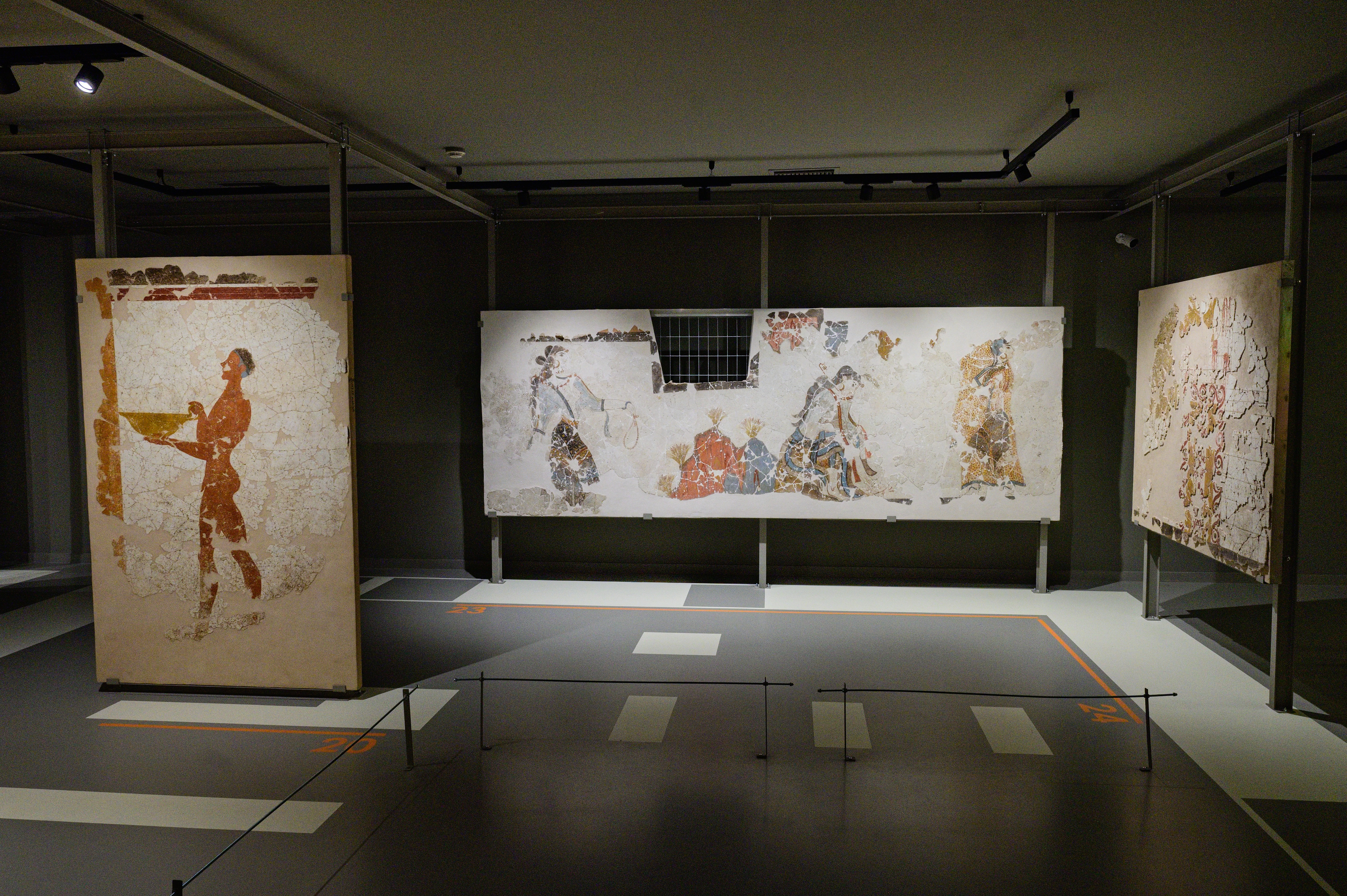 A ritual with crocus, saffron harvest and Rite of Passage. Frescos from Akrotiri, Xeste 3, Room 3, Ground floor, 17 th century BC. Prehistoric Museum of Thira, Fira, Santorini.